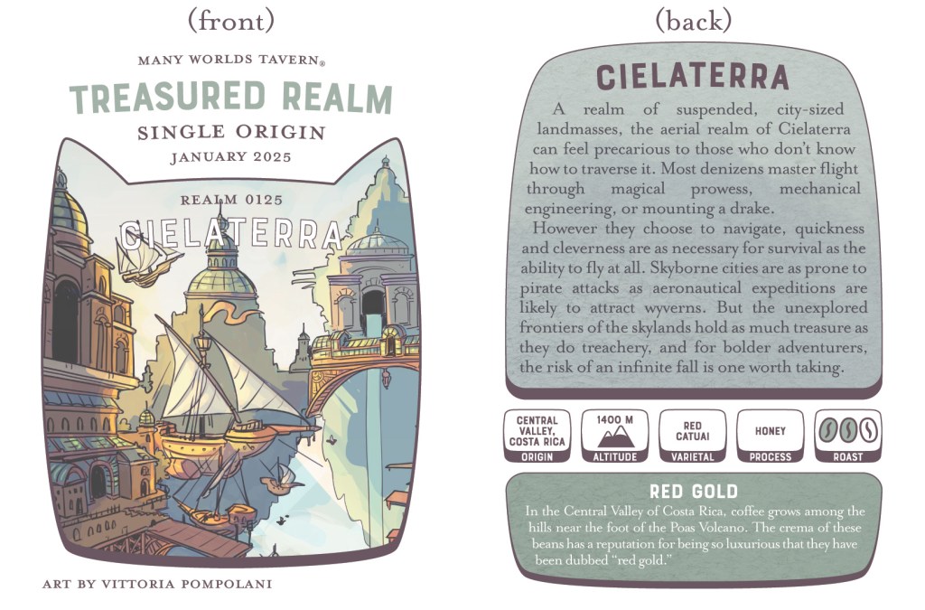 Leading with a visual vignette of the realm’s landscape, these cards are part of the immersive experience of the Treasured Realm monthly coffee series, which is Many Worlds Tavern’s flagship product. The small emblems and blurb below the realm’s lore add some function to the card’s fashion, tracking each premium coffee’s details.