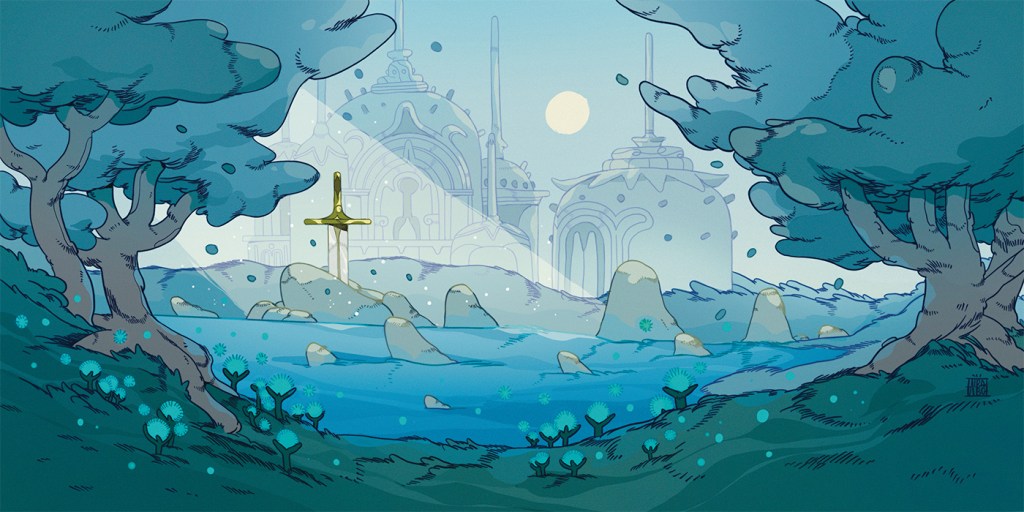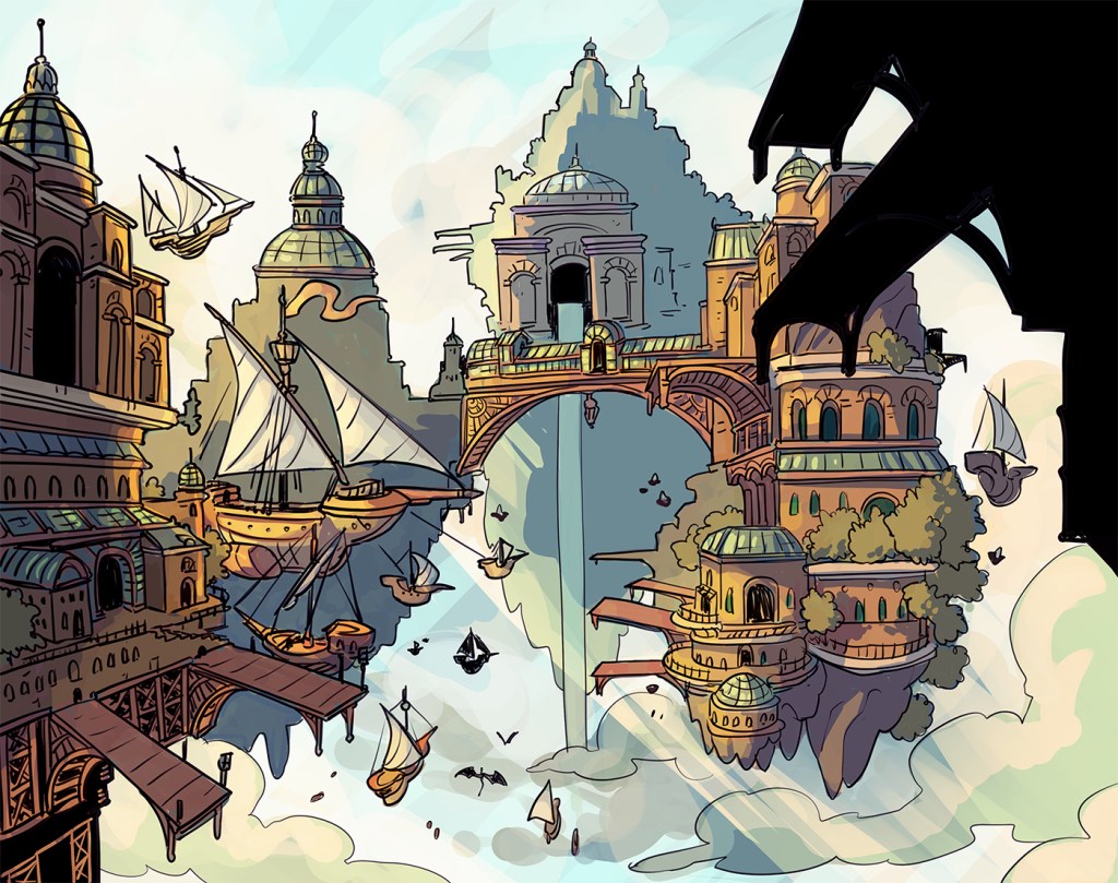Enchanted with fallen stardust and astral magicks since a meteor shower rained into its waters centuries ago, the Ethersea’s flora and fauna have since evolved to match the mystery of the stars. Beauty is abundant on the water’s surface, with clouds and water sparkling alike as if the endless night sky never truly leaves.