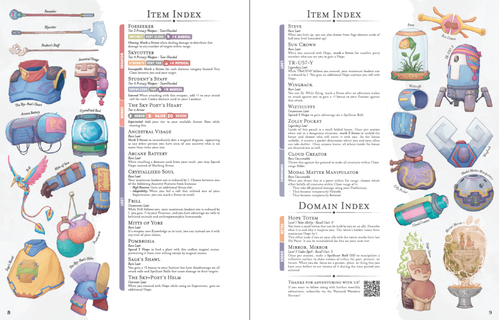 While most of this seems like narrative design, the mechanical meat was at the end of each Gazette, where characters of interest were followed up with designed items and abilities, all created with Daggerheart in mind (and with D&D-compatible versions also available to subscribers).